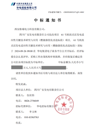 贺华电四川广安发电有限责任公司61号机组灵活发电适应性关键技术研究与应用项目成功中标